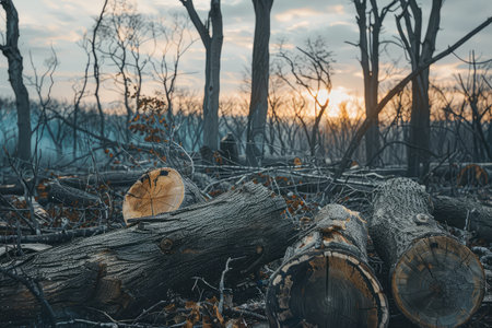 Clear-cut trees and muddy ground depict extensive deforestation in a wooded area. The early morning sky reveals clouds and sunlight filtering through the trees, highlighting the destruction.