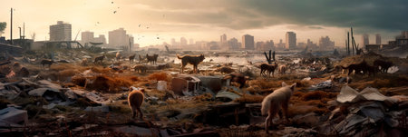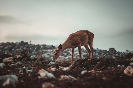 Wild deer foraging for food among heaps of garbage in a landfill, highlighting the urgent issue of environmental pollution and its impact