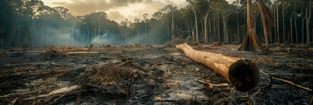 Dramatic panoramic view of a vast deforested area with scattered logs and stumps amid surrounding pine forests and mist-veiled peaks under warm sunset glow, ideal for environmental campaigns, forestry ads, and nature documentaries. Captures raw land transformation for impactful banners, editorial features, and climate awareness visuals.
