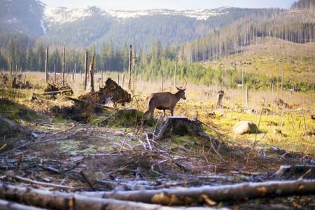 Wild animal in a deforested area on wildlife habitats. Animal in the middle of a felled forest. Deforestation's on Wildlife concept.