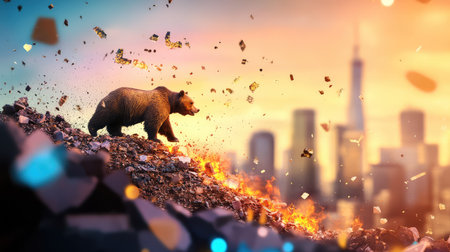 A majestic bear prowls over a fiery hill, contrasting the serene urban skyline at twilight, highlighting the beauty and power of nature amidst a modern landscape.