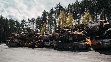 Irpin, Kyiv region, Ukraine - 28 April 2022: Car graveyard in Irpin, consequences of the invasion of the Russian army in Ukraine. Destroyed cars of civilian population.