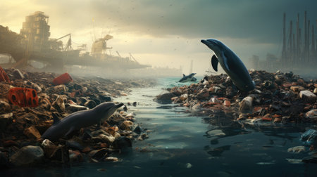 Ecological pollution of the environment by garbage waste and landfills near factories and factories. Meerkats and Ferrets survive in the polluted lake area. Made in AI