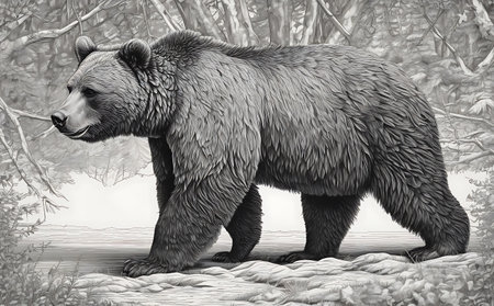 Digital painting of a grizzly bear in winter forest, monochrome