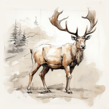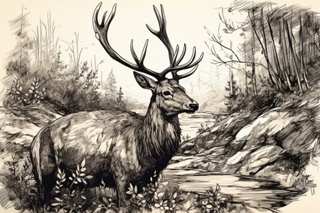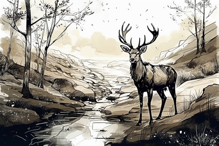 Hand drawn deer in his natural habitat. Ink illustration created with generative AI