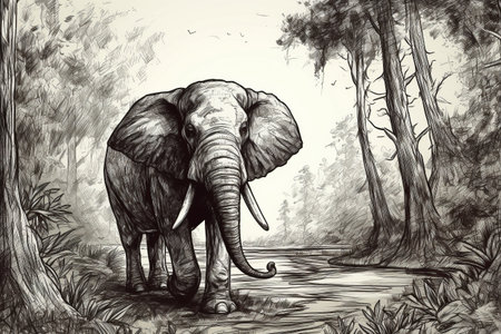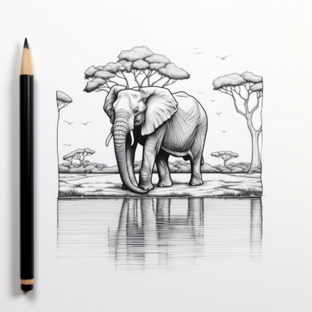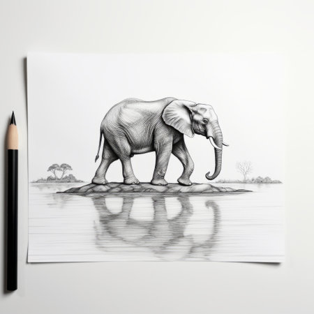 an elephant stands gracefully near a serene water area in this captivating pencil drawing. the portrait illustration showcases intricate details and symmetry, created with the use of ink. the sketch is done in the style of uhd image, with monochromatic tones and high-contrast shading. this charming character illustration is inspired by nature and showcases the artist's talent in creating captivating compositions. this artwork is a