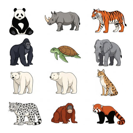 A collection of diverse animal species including a panda, rhino, tiger, gorilla, turtle, elephant, polar bear, orangutan, and serval cat.