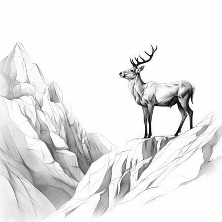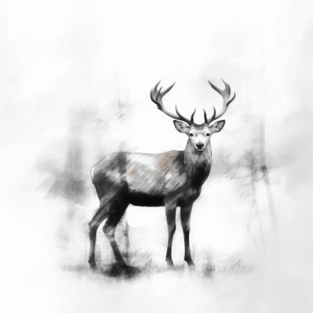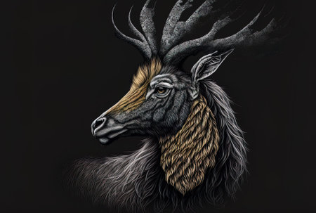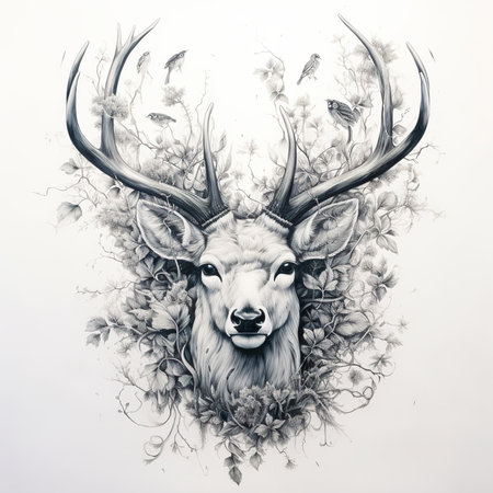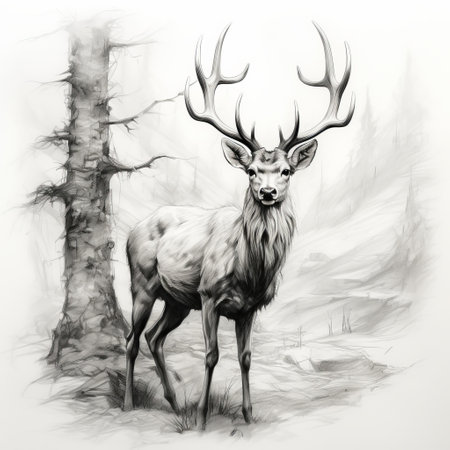 a realistic and hyper-detailed ink sketch of a deer in the forest. this black and white full-size artwork is created in the style of 2d game art, using traditional oil-painting techniques. with sepia tones and photo-realistic details, it showcases the beauty of scottish landscapes. the intricate character design adds depth to this detailed rendering. ai generated