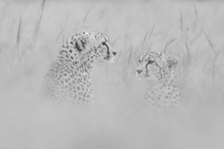 Mono two cheetahs sitting in blurred grass