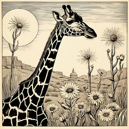Hand drawn ink illustration of a giraffe in its natural habitat. Created with generative AI.