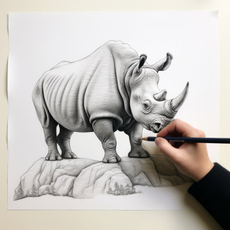 Hand drawn ink illustration of a rhinoceros in its natural habitat. Created with generative AI.