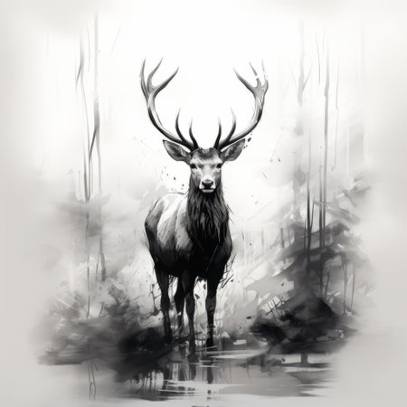 a majestic stag stands in the water amidst a serene woods, surrounded by towering trees. this speedpainting-style photograph captures the essence of moody black and white tones, showcasing the beauty of nature and its characterized animals. the realistic usage of light and color adds depth to the image, while elegant inking techniques enhance the overall aesthetic. with an emphasis on character design, this captivating photo
