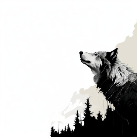 a wolf, turned sideways, gazes up with pleading eyes, as if asking for food, set against a crisp white background, emphasizing the simplicity and elegance of this abstract, minimalistic vector art, featuring a striking white and black color scheme. ai generated
