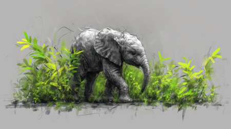 Digital painting of an elephant standing in the grass with green plants.