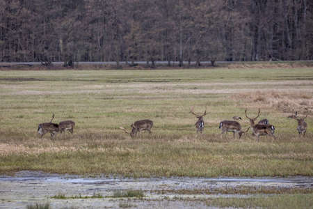 A herd of deers in the so called Mönchbruch natural reserve in Hesse, Germany at a cloudy day in spring.