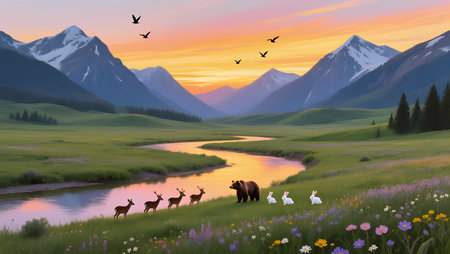 Migration of birds to the west, animals fly over the mountains at sunset.