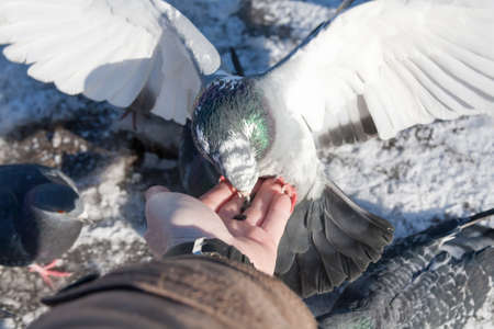 Hand feeding pigeons in urban setting
