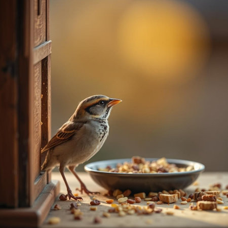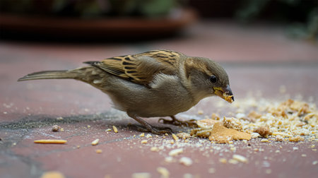 Delicate songbird enjoying scattered seeds in sunbeam, tranquil natural moment captured