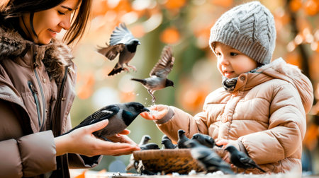 A young child in a red jacket feeds seeds to a bird in a park covered with autumn leaves. The scene captures the joy of nature interactions.