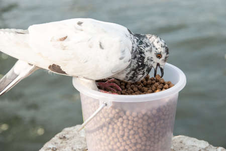 A cute white female pigeon eating food on the hand from a bucket
