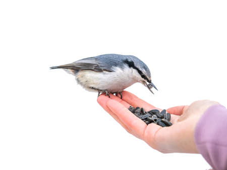 The Eurasian nuthatch eats seeds from a hand, isolated on white background. Hungry bird wood nuthatch eating seeds from a hand during winter or autumn. Caring for animals in winter or autumn.