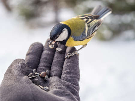 A tit sits on a man's hand and eats seeds. Taking care of birds in winter.