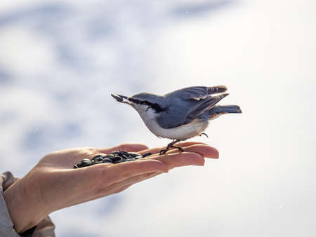 The Eurasian nuthatch eats seeds from a palm. Hungry bird wood nuthatch eating seeds from a hand during winter or autumn. Caring for animals in winter or autumn.