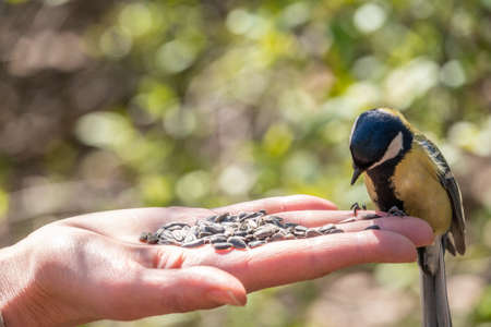 Tit eats food from the hand of an elderly person in a green forest in the sunny spring day. Bird lovers, birdwatching. A beauty of the environment nature. Ornithology, International bird day concept.
