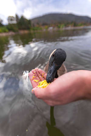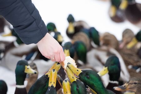 Close-up of hand feeding a duck outdoors in the snow