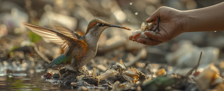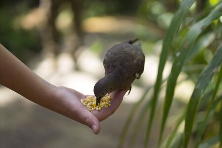 Person feeding a wild bird by hand in a nature park with seeds in his palm as the bird perches on his fingers pecking at the seed