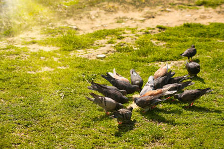 Landscape. Birds, pigeons gathered in a pack. They walk along the soil with green grass and peck crumbs of bread. In the distance