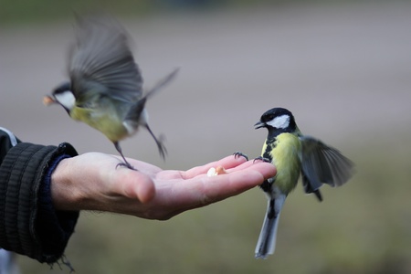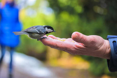 Feeding great tit birds from hand in city park