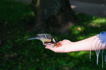 Girl feeds a tit from a palm. A bird sits on a woman's hand and eats seeds. Caring for animals in spring or autumn.