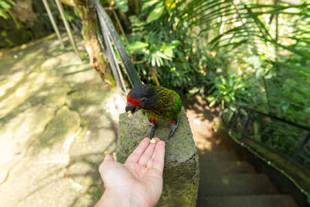 Woman feeding sweet nectar to Colourful parrot Rainbow called Lorikeet, sitting on the branch of a tree in a zoo
