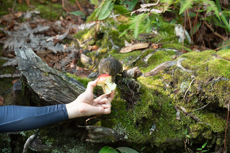 Lake Tahoe, Nevada - January 2020: A visitor holds a mountain chickadee on Lake Tahoe's Chickadee Ridge, a popular hiking spot for sighting the birds,
