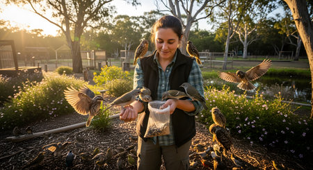 A smiling woman, possibly a zookeeper or ranger, feeds a flock of small birds that are perching on her arms and flying around her. The interaction takes place in a sunny outdoor nature park with eucalyptus trees in the background.