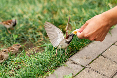 Feeding young Sparrow (passer domesticus) at the waterfront of Geneva. The human hand with crumbs of bread. Summer day. Blurred the background. Do good
