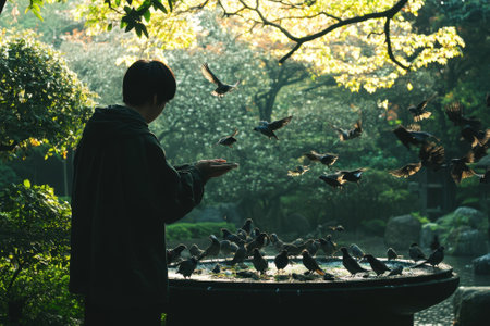 A person feeds small birds in a tranquil garden, surrounded by lush greenery and soft sunlight.
