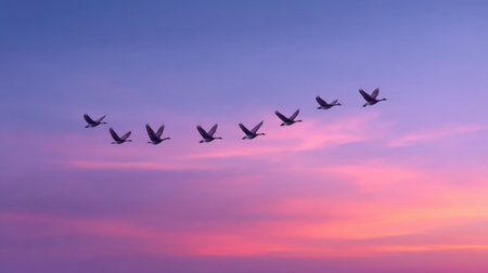 A stunning image of a flock of birds soaring across a vibrant sunset sky. The colorful hues create a serene atmosphere, perfect for nature lovers.