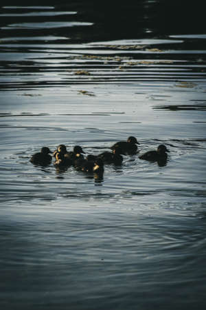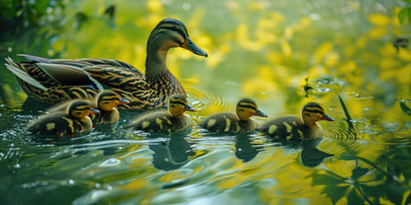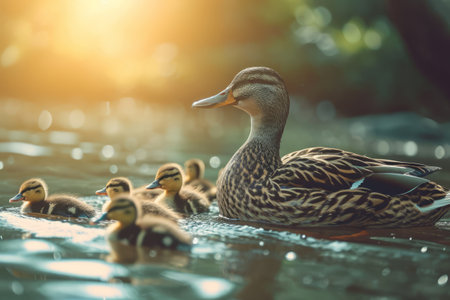 A mother duck leading her ducklings across a pond. Experience the heartwarming sight of a mother duck gently guiding her ducklings across a serene pond