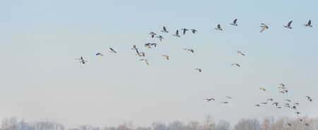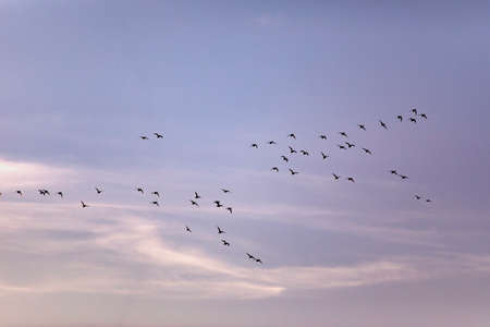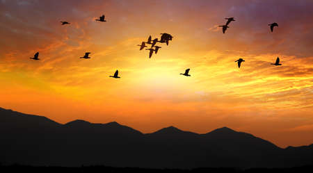Flock of geese flying in the sky at sunset. Geese flying in the sky.