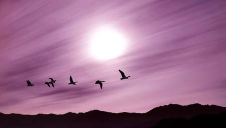 Beautiful duck group flying with soft morning sunrise light. Clouds in the background and warm tone.