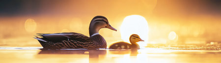 A mother duck with her duckling, swimming together in a serene pond at sunset