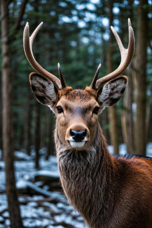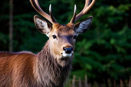 A deer stands on a rock in a forest. The deer is brown and has large antlers. The forest is lush and green, with trees and bushes surrounding the deer. Concept of peace and tranquility