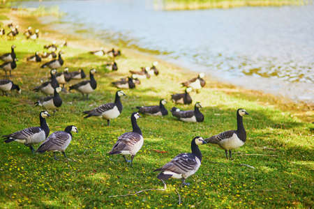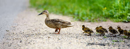 The female duck leads the ducklings on a stroll in the waterside meadow