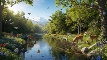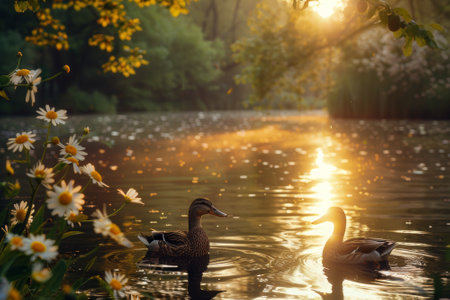 A serene lake surrounded by blooming flowers and lush greenery, with ducks and frogs quietly enjoying their natural habitat, under a golden sunset.. AI generated.