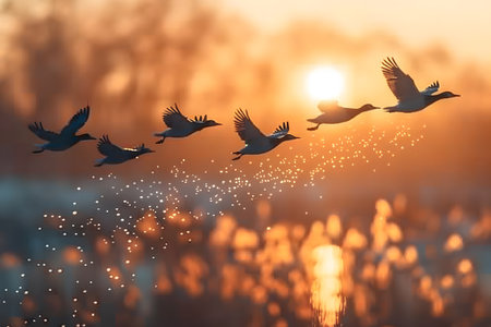 Migrating birds fly gracefully across a serene body of water during a golden sunrise, capturing the essence of tranquility and the beauty of nature. the warm hues and sparkling water droplets create a magical and peaceful atmosphere, ideal for nature and wildlife photography. Generative AI