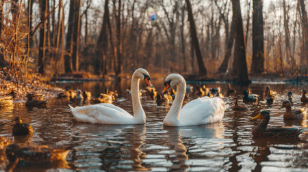 Two elegant swans swim gracefully in a serene pond, surrounded by a flock of ducks and trees, capturing a tranquil moment in nature.