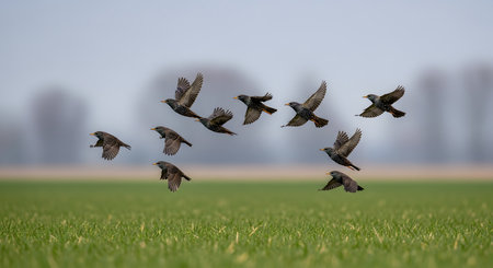 A flock of starlings flying in synchronized formation over a green field. The murmuration creates a dynamic pattern against the sky, symbolizing unity, migration, and the beauty of wildlife in motion.