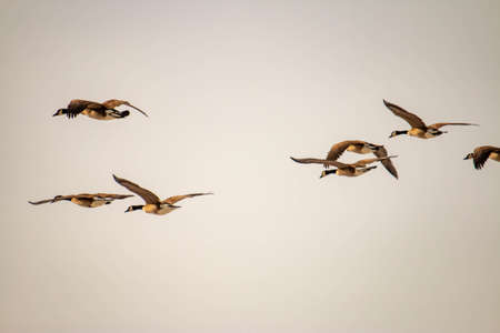 Flock of Canada Geese Flying in a Blue Sky at Sunset